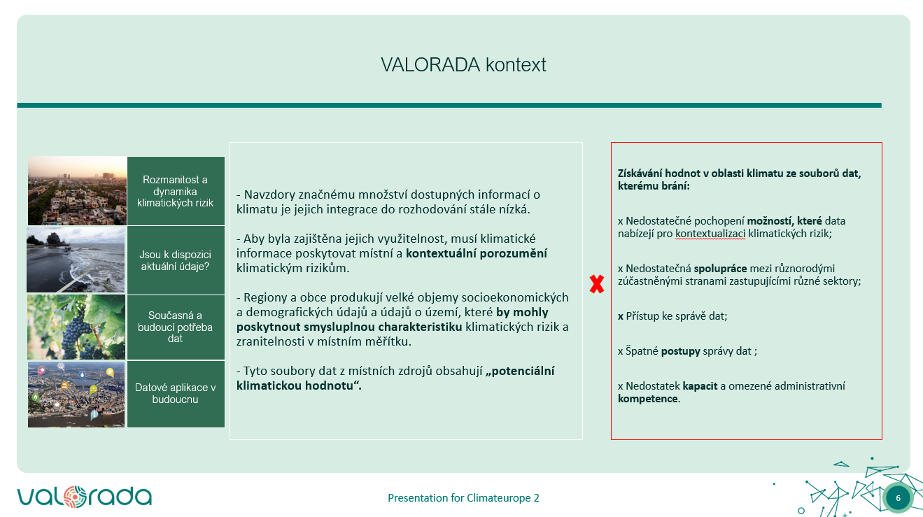 Part of a broader series of workshops designed to extend the reach of the project beyond its core consortium, this session focused on real use cases of VALORADA’s indicators and visualisation tools in cities exposed to urban heat, drought, and hydrological extremes. The event was held in Czech and targeted local planners, decision-makers, and technical staff from municipalities with similar environmental challenges.